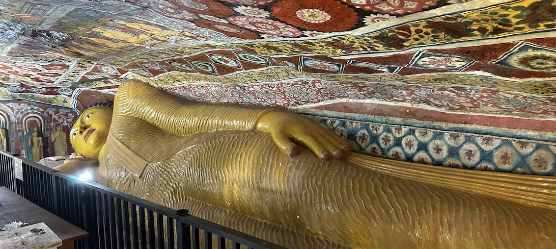 Über Treppen gelangt man zu verschiedenen Ebenen, jede mit einem eigenen Höhlentempel. Die Wandmalereien leuchten in warmen Gold-, Rot- und Ockertönen. Mehrere liegende Buddhas empfangen die Besucher – ein Zeichen tiefen Friedens.