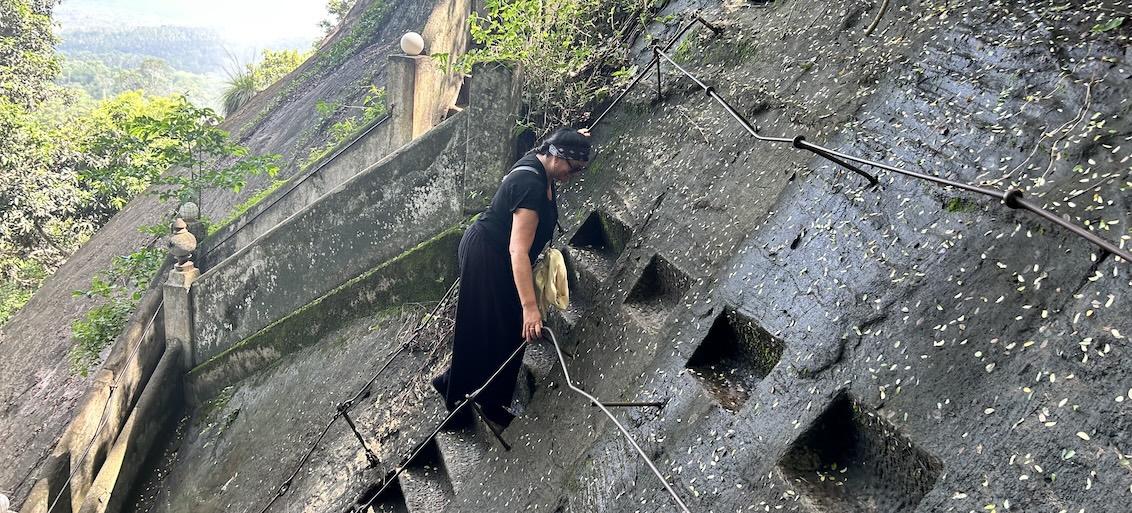 Die letzten Meter dorthin waren die steilsten – ein echter Kraftakt. Und als wir die oberste Plattform erreichten, waren wir wirklich komplett klitschnass, als hätte man uns einmal durch einen tropischen Regenguss geschickt. Das Klima Sri Lankas kennt eben keine Gnade.