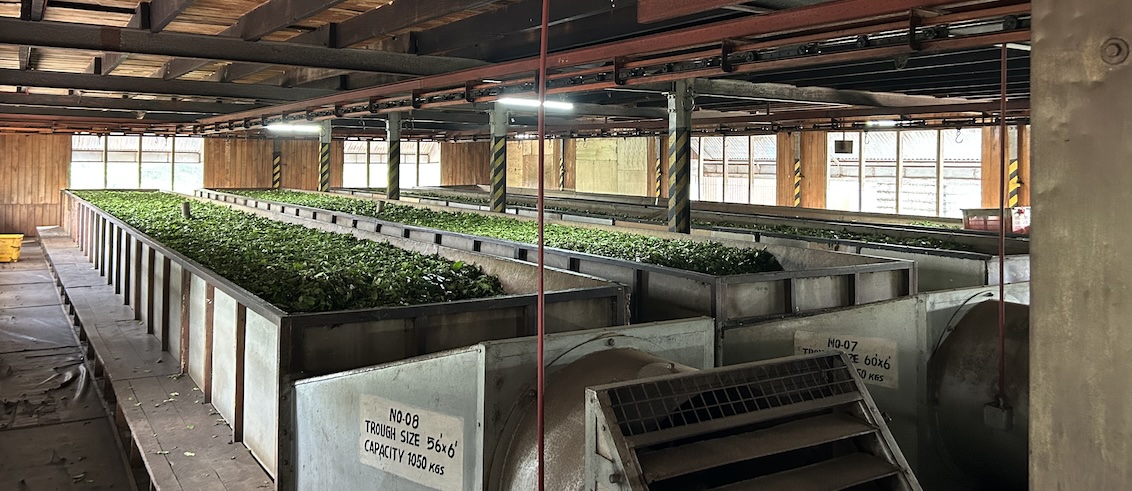 In langen, luftdurchströmten Rinnen werden die frischen Blätter ausgebreitet. Über mehrere Stunden verlieren sie rund die Hälfte ihrer natürlichen Feuchtigkeit. Dadurch werden sie weich genug, um weiterverarbeitet zu werden – und gleichzeitig beginnen sich erste Aromen zu entwickeln.
